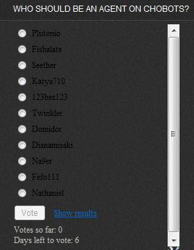 Hello chobotss!! I started an agent poll here ;) Who should be an agent on chobots? Only 6 days to vote so vote quick! If someone in fishgang will win they will gain 15 pnts!!! ;)